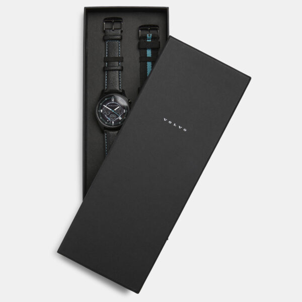 Solar-powered chronograph with Volvo-designed watch face, appealing to people in business and style seekers alike. Fitted with mineral glass and exchangeable straps in leather and woven fabric. Supplied in a Volvo presentation box.